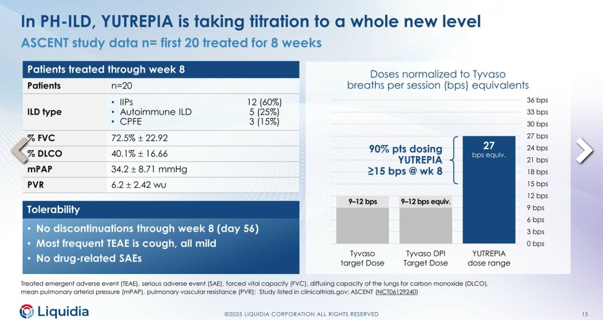 ➡️Yutrepia parece superior a su competidor y puede darse a niveles de dosis mucho más altos que Tyvaso DPI. Por ejemplo, pueden suministrar mucho más del ingrediente activo sin que los pacientes tosan y tengan una reacción adversa. Parece ser que casi la mitad de los pacientes de EPI con Tyvaso dejan de utilizarlo debido a este problema, lo que en sí mismo debería suponer una enorme ventaja para LQDA.